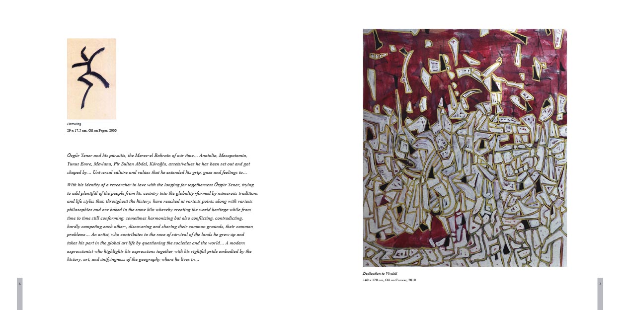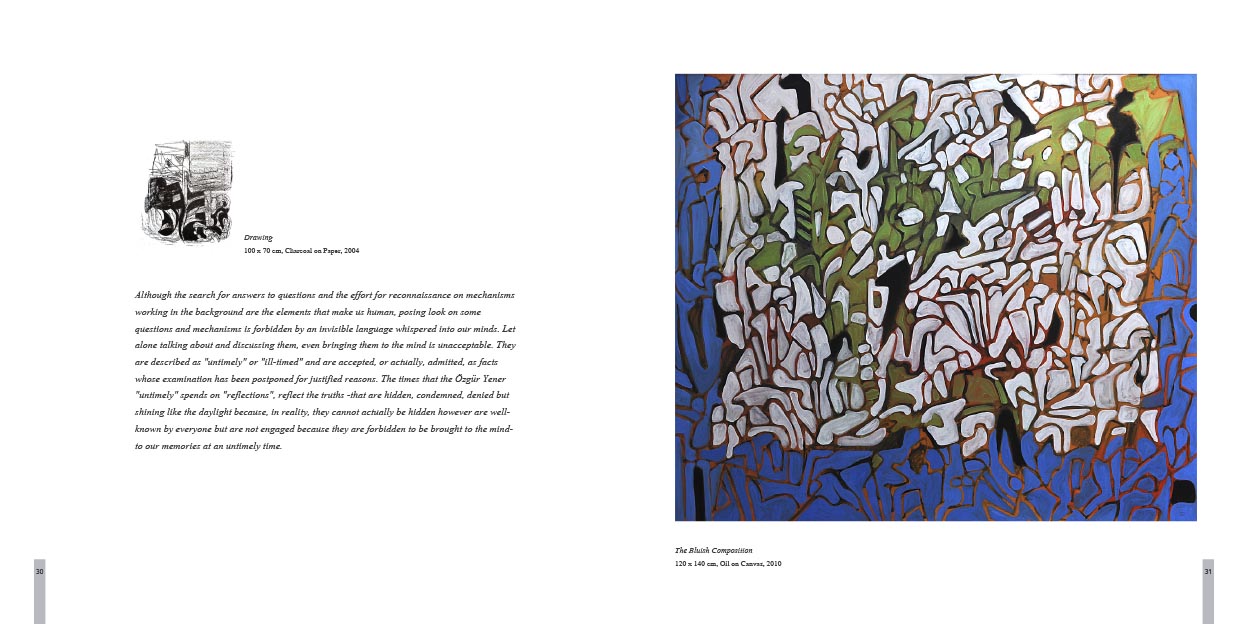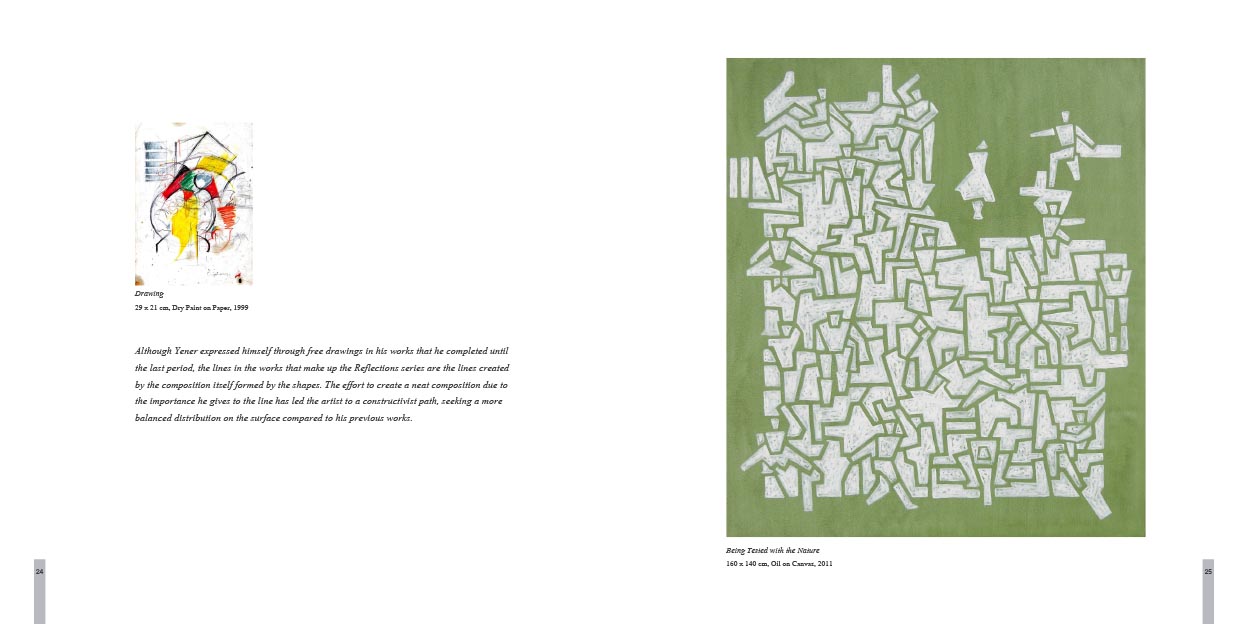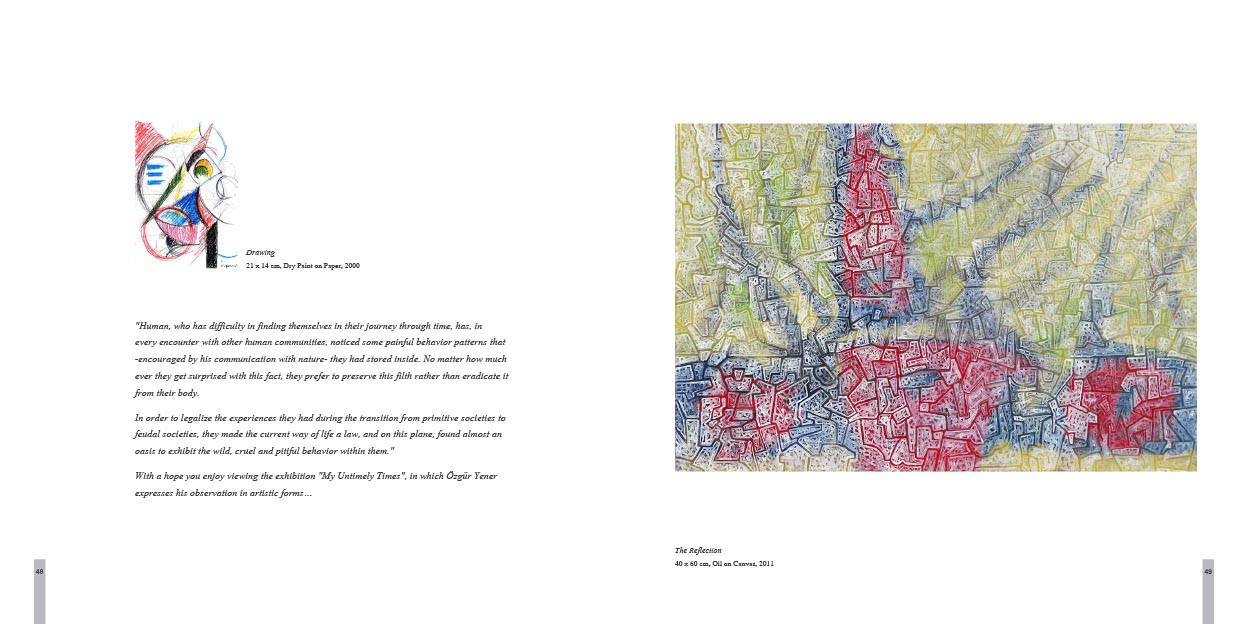In my works that I exhibited in my "My Timeless (Ill-Timed) Times" exhibition in 2012 with the term "reflections", I symbolized the integrity/indivisibility of the society, and basically expressed three phenomena: the ego impulses, the human embodiments driven by the ego impulses, and the obscurity and the consumption of the pure reality and of the nature by the human embodiments. The arithmetic balance enjoyed on canvases depends on the existence of all of the human embodiments. The impulses (drives) that generate for the reason of being alive dismantle space and time. This disintegration caused by the interactions among the impulses turns the existence to understandable and makes the human an entity that questionize themselves. I contribute to the said questioning with the network theory that I have formulated on my own observations. On my thesis of "contingency and affectivity" (state of being adjacent and influencing), I express that the human, ironically, despite their said quizziness, legalizes a structure formed just by egos and, thereby, stretches and destroys the "array".