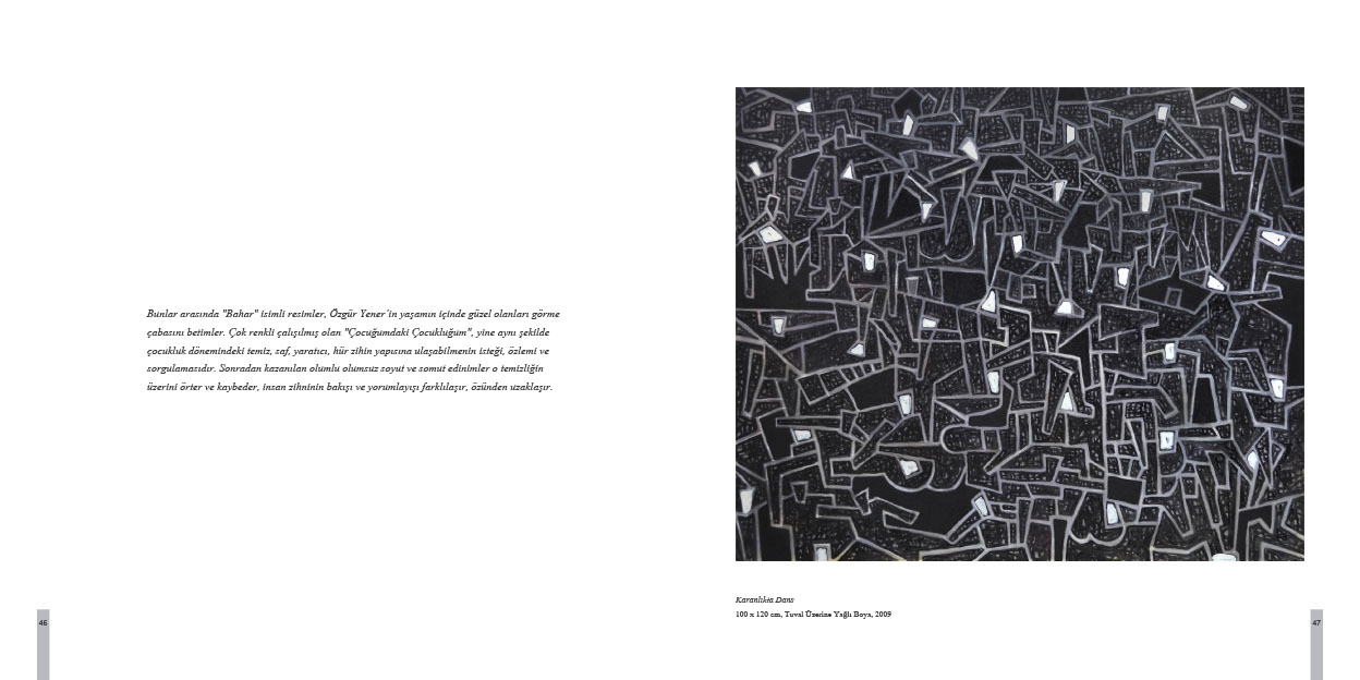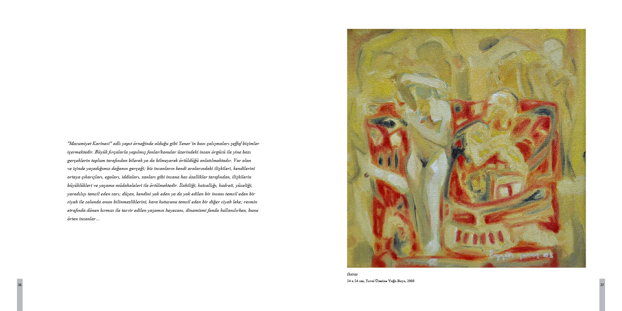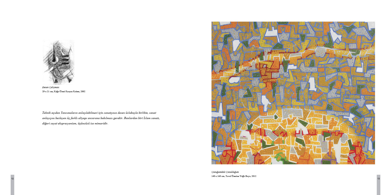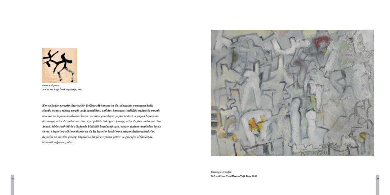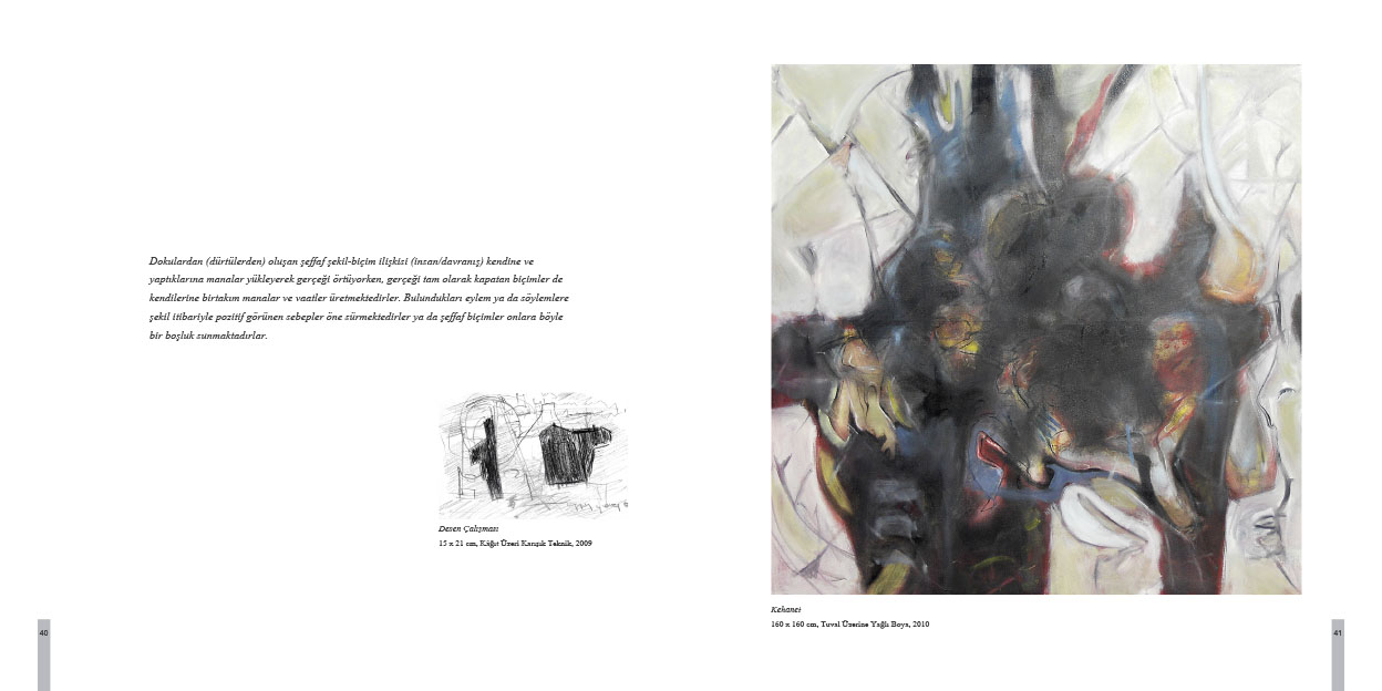 Eserlerin yaratımında, toplumsal baskı ve hoyratlıkları geometrileştirme arayışları mevcuttur. Bu arayışlar sonucu obje kenarları halinde görüntü kazanan matematiksel patlamalar daha önce hiç yapılmamış bir cüretle hesaplayıp denediğim uygulamalardır. Gördüğüm toplum-birey yapılanmasını konstrüktif bir anlayışla ve teknik bakımdan geleneksel bir tavırla resmederken, renk olarak kabul edilmeyen beyazı vahşi bir şekilde uygulayarak, genel kanaatlerin ne kadar aksi tarafında bir yerlere ulaşmış olduğumu iletmekte, önermem kapsamındaki resimlerim.