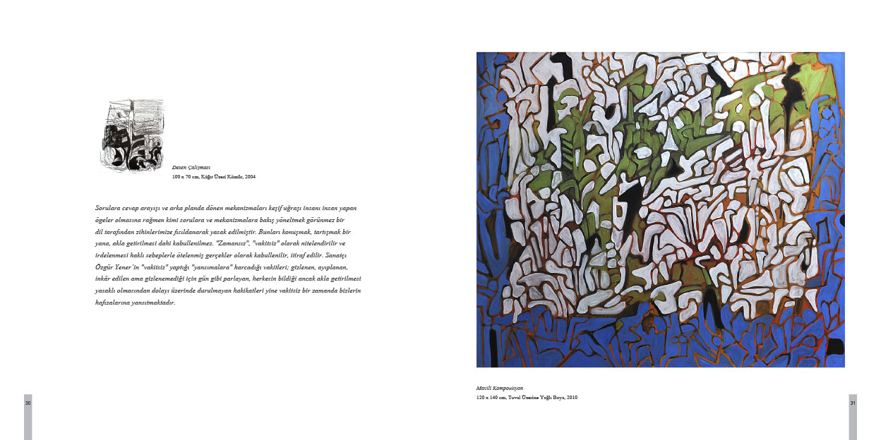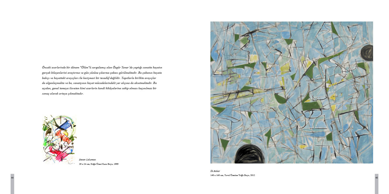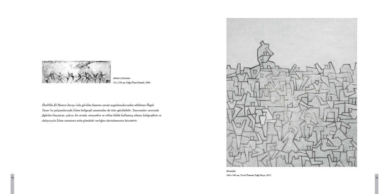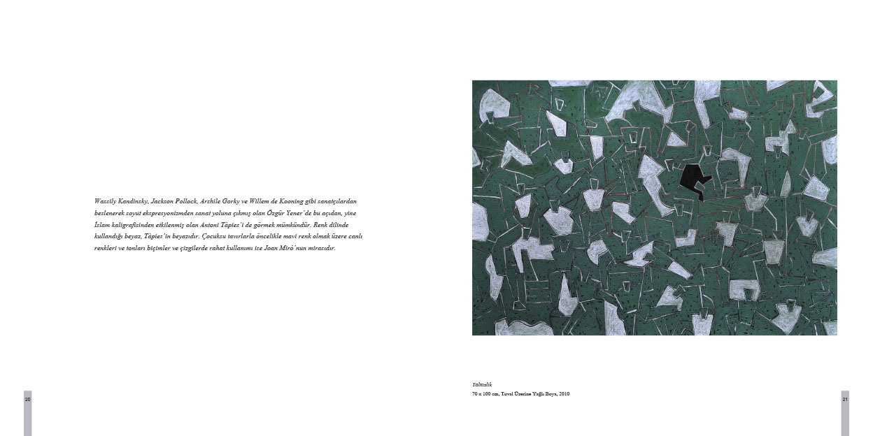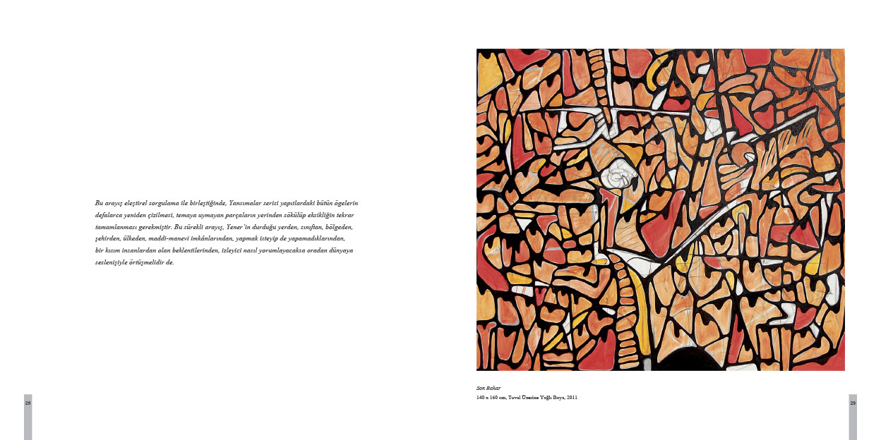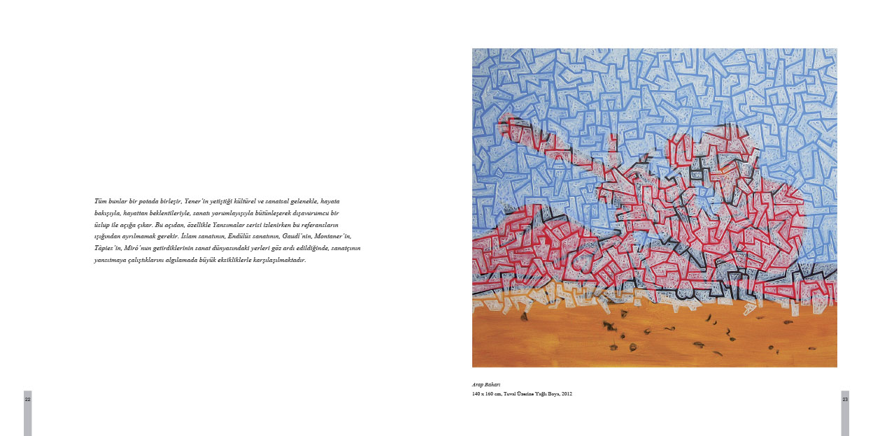 Eserlerin yaratımında, toplumsal baskı ve hoyratlıkları geometrileştirme arayışları mevcuttur. Bu arayışlar sonucu obje kenarları halinde görüntü kazanan matematiksel patlamalar daha önce hiç yapılmamış bir cüretle hesaplayıp denediğim uygulamalardır. Gördüğüm toplum-birey yapılanmasını konstrüktif bir anlayışla ve teknik bakımdan geleneksel bir tavırla resmederken, renk olarak kabul edilmeyen beyazı vahşi bir şekilde uygulayarak, genel kanaatlerin ne kadar aksi tarafında bir yerlere ulaşmış olduğumu iletmekte, önermem kapsamındaki resimlerim.