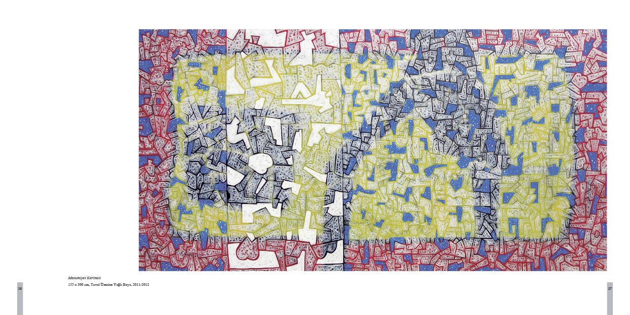Toplum içinde bazen kalabalık ve kargaşa kesitleri sunan dizin üyesi bireylere ait kimi uzuvların aşırı hareket halinde olup birey egosunu zirveye taşıdığı görülebilir. Kimi bireylerde kimi uzuvlar ise körelmiş, yer bulamamış ya da daha baskın olan bir başka birey uzvu tarafından yok edilmiştir, ezilmiştir. Bunu bertaraf etmek adına ihtiyaç duyulan yeni alanları açmaya yeltenmek, bütün dengeyi yani toplumu ortadan kaldırır çünkü mevcut hal çerçevesinde bireyler aralarında dinamik bir "ağ" kurmuşlar ve birbirleri sayesinde işlev görmektedirler. Bu zorunlu asimetrik bitişiklik ve etkisellik sonuçta saf realiteyi, doğanın gerçekliğini örter ve tüketir. Eserlerin yaratımında, toplumsal baskı ve hoyratlıkları geometrileştirme arayışları mevcuttur. Bu arayışlar sonucu obje kenarları halinde görüntü kazanan matematiksel patlamalar daha önce hiç yapılmamış bir cüretle hesaplayıp denediğim uygulamalardır. Gördüğüm toplum-birey yapılanmasını konstrüktif bir anlayışla ve teknik bakımdan geleneksel bir tavırla resmederken, renk olarak kabul edilmeyen beyazı vahşi bir şekilde uygulayarak, genel kanaatlerin ne kadar aksi tarafında bir yerlere ulaşmış olduğumu iletmekte, önermem kapsamındaki resimlerim.